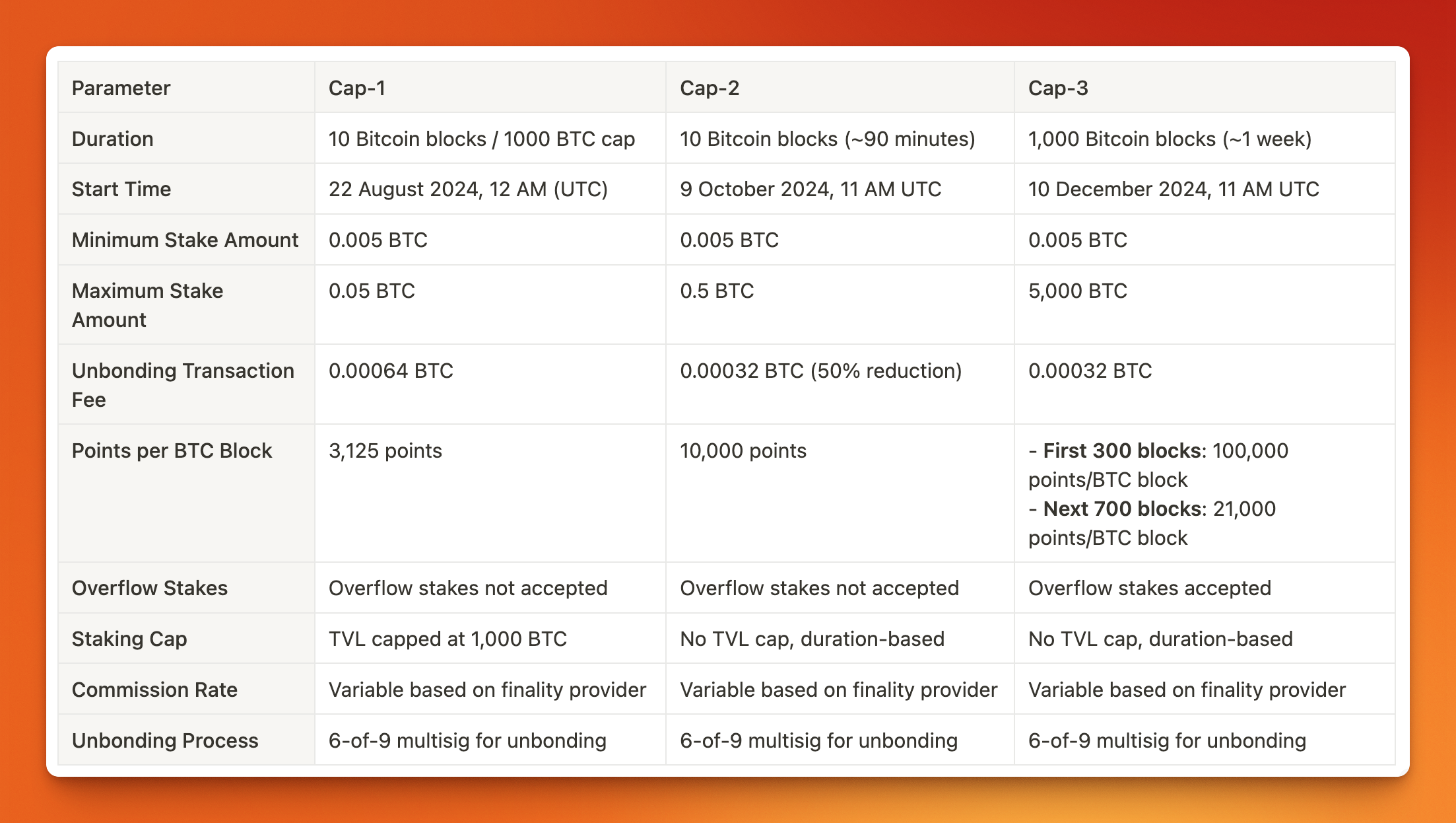 Cap-3 introduces updated staking parameters: the minimum stake per transaction remains at 0.005 BTC, while the maximum stake per transaction increases to 5,000 BTC. The unbonding transaction fee is set at 0.00032 BTC.
