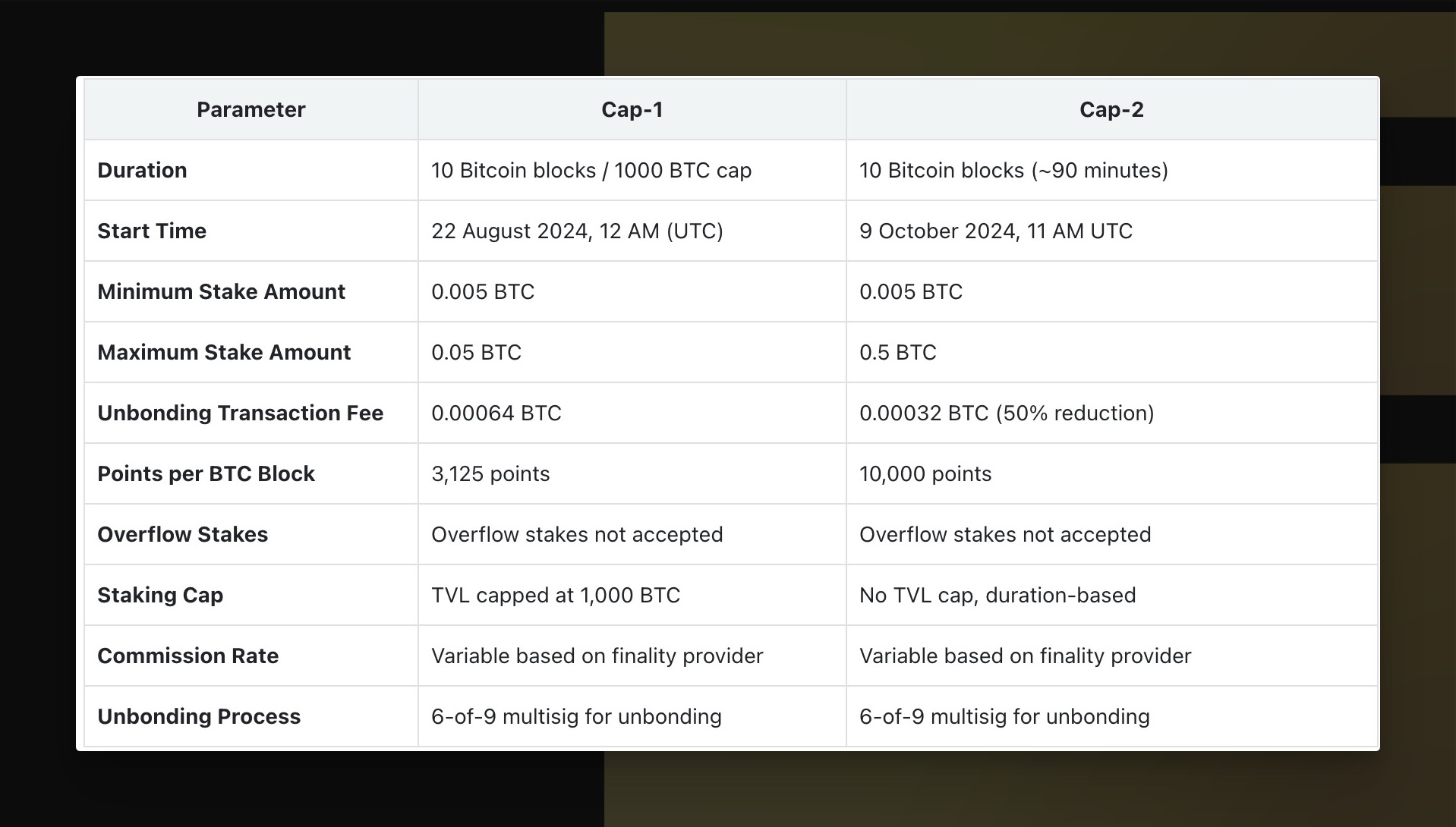 Cap-2 will officially begin on October 9, 2024, at 11 AM UTC. This phase will last for 10 BTC blocks, giving users around 90 minutes to stake their BTC.