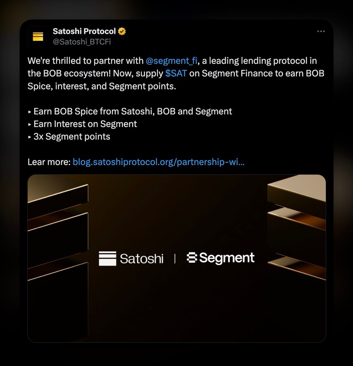 We formed a strategic partnership with Segment Finance, a lending protocol on the BOB ecosystem. This collaboration enables users to supply their $SAT stablecoin on Segment Finance, earning both BOB Spice and interest.
