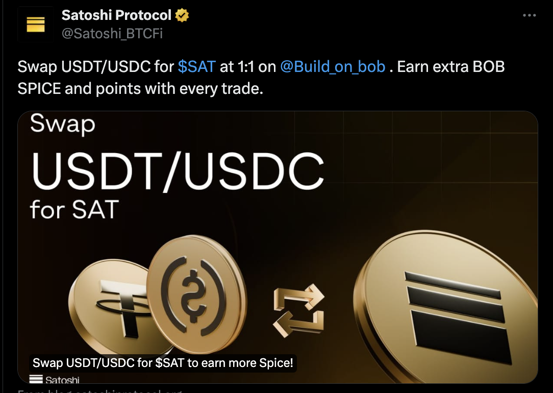 This development marks a significant step towards expanding the utility and adoption of $SAT within the BOB ecosystem.By holding $SAT, users can earn increased BOB Spice rewards (1.3x multiplier), leverage $SAT to participate in various DeFi activities, and generate passive income through liquidity pools and lending protocols