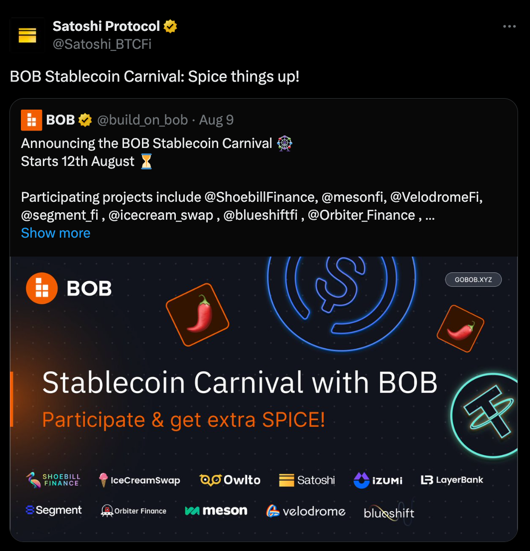 Satoshi Protocol is participating in the BOB Stablecoin Carnival, a collaborative event aimed at boosting stablecoin liquidity and user engagement within the BOB ecosystem. The carnival, which commenced on August 12th, brings together a diverse group of DeFi projects to offer exciting opportunities for users.