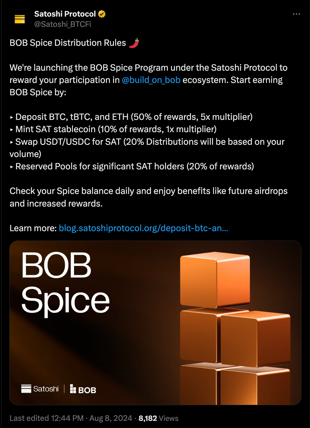 We launched the BOB Spice Program, a new initiative to incentivize user engagement within the BOB ecosystem. This program rewards users with BOB Spice for specific actions taken on the Satoshi Protocol platform.