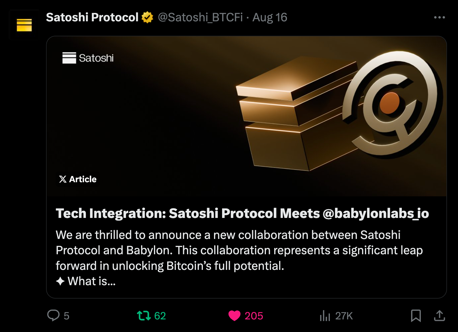 We collaborate with Babylon to enhance Bitcoin’s utility. By combining Bitcoin staking with $SAT, users can unlock liquidity, earn rewards, and improve blockchain security. This collaboration is a significant step forward for Bitcoin Ecosystem.