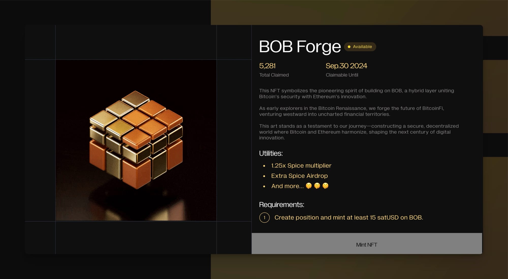 Within the Satoshi Protocol, actions like depositing BTC, tBTC, and BTC LST, and minting satUSD will make users eligible to share BOB Spice.