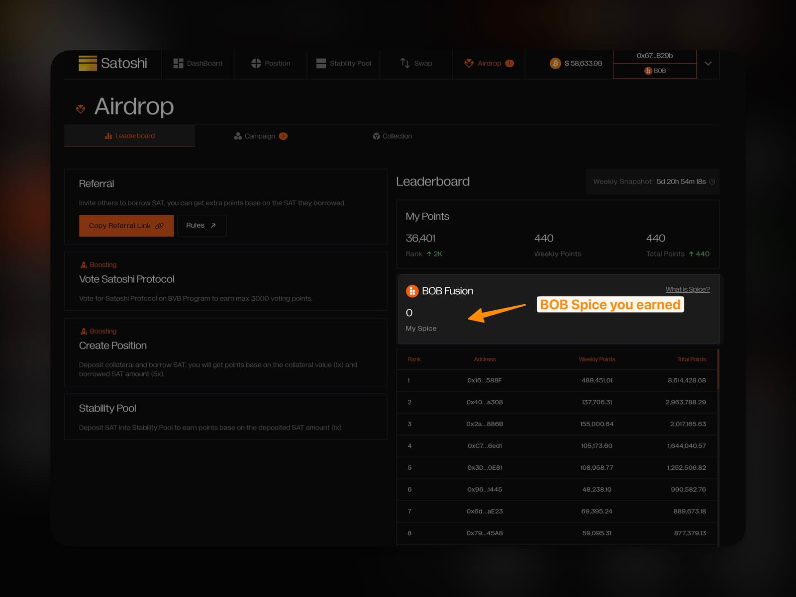 BOB Spice is a reward system for BOB ecosystem early adopter. Users can earn Spice by participating in various DeFi activities, such as stake BTC, mint satUSD, provide liquidity & trade on DEX, supply assets on lending.