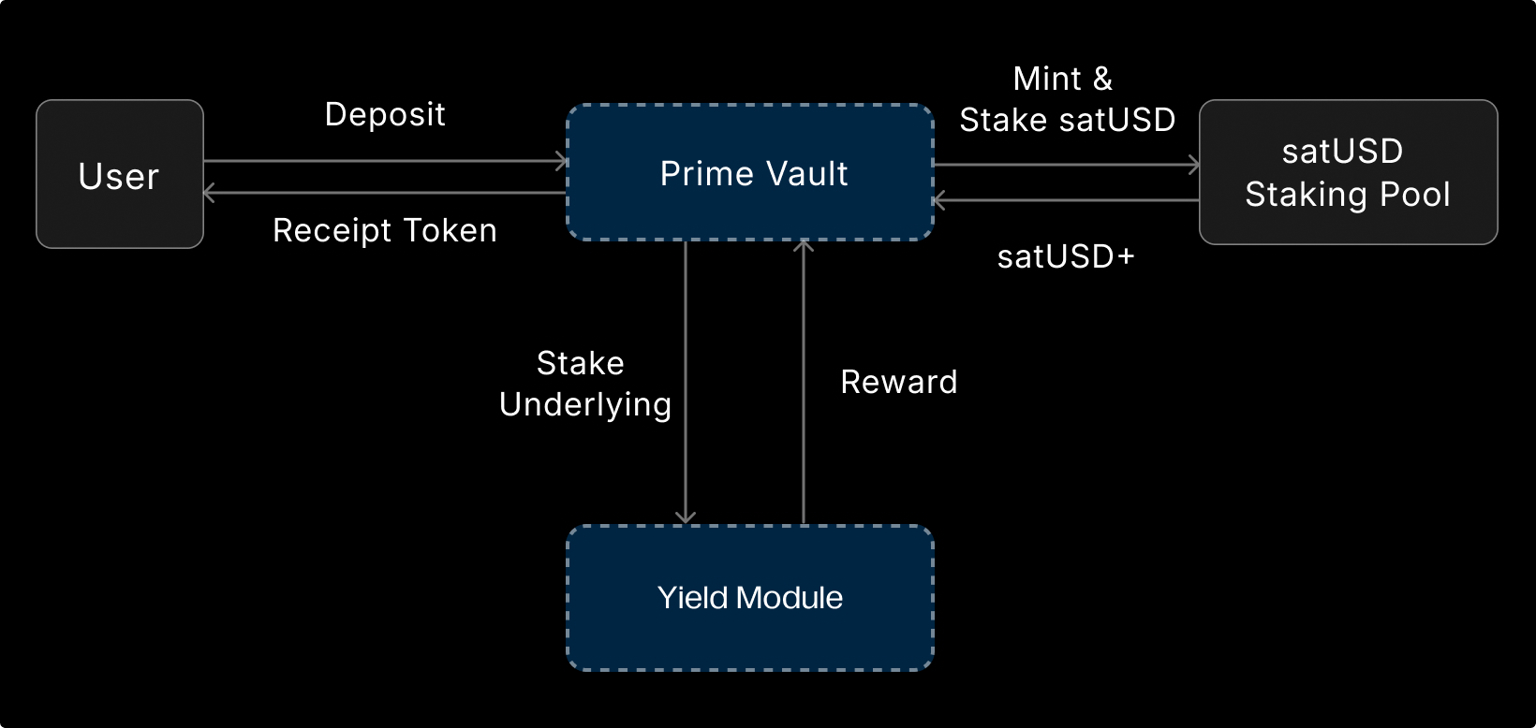 Institutions can deposit assets into the system, automatically mint & stake satUSD, access yield opportunities with custodian wallet.