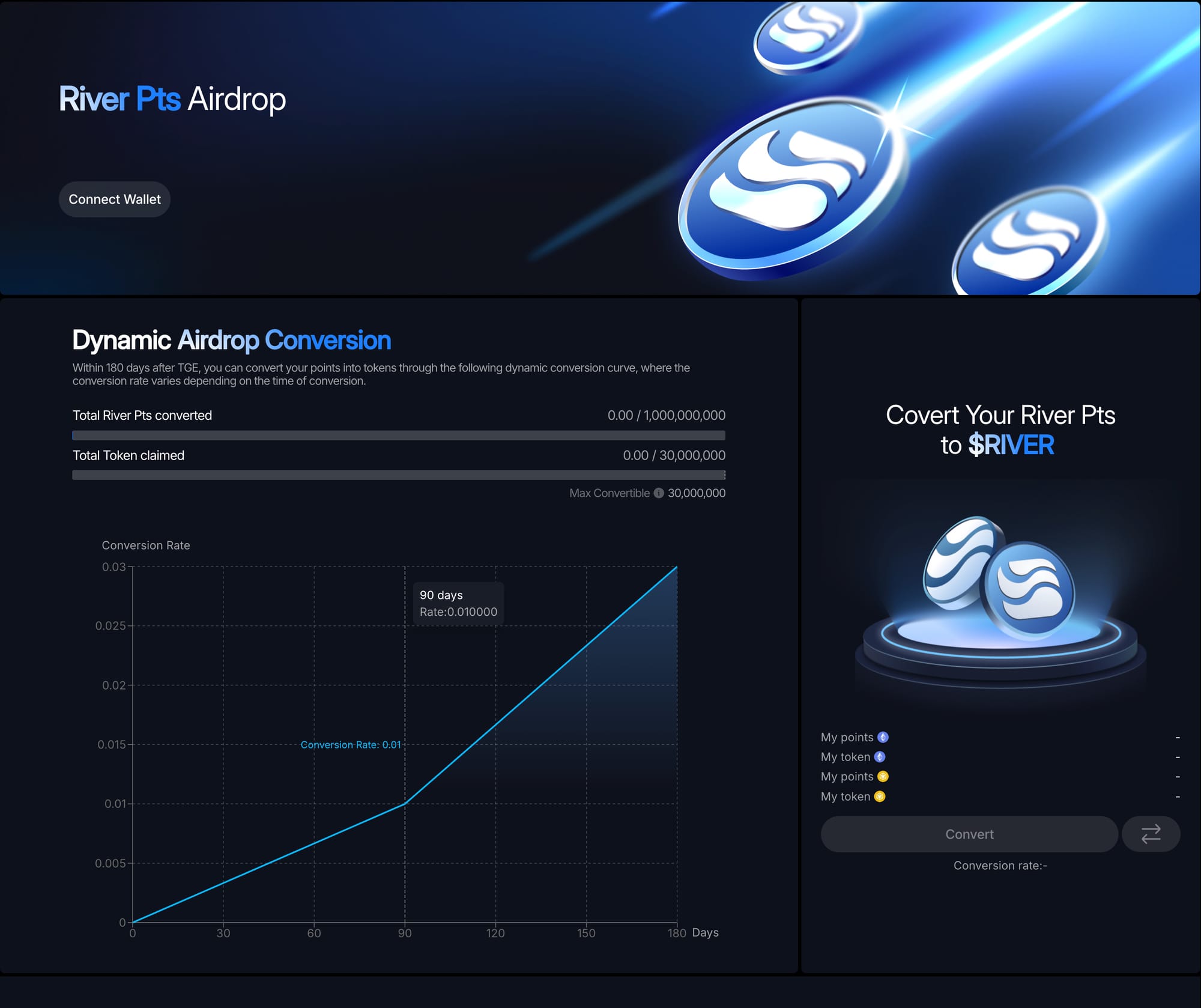 Holders can convert their River Pts into $RIVER anytime during the 180-day window — in one transaction or multiple.