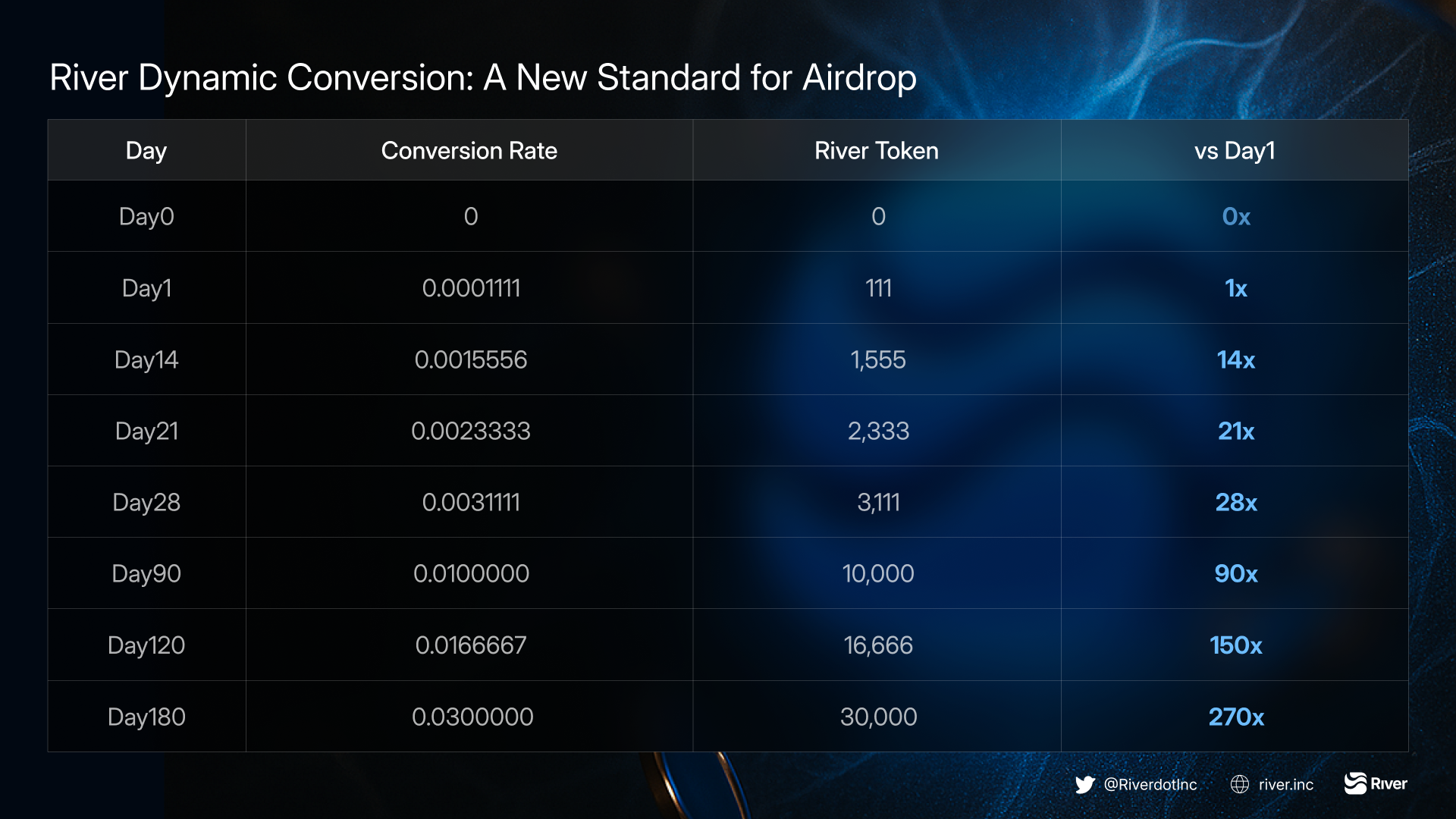 River’s airdrop does not end in a single claim. Instead, it unfolds over 180 days through a dynamic airdrop conversion system that ties value to time.