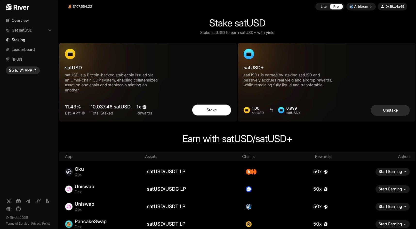 River’s deployment brings satUSD into this ecosystem with full support for minting, staking, and liquidity provisioning on Arbitrum-native apps.