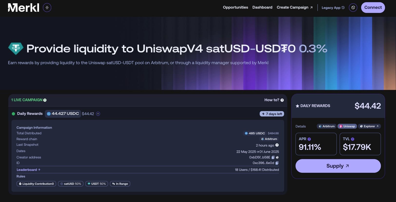 To support the launch, River has partnered with Merkl to incentivize the satUSD-USDT pool on Arbitrum: