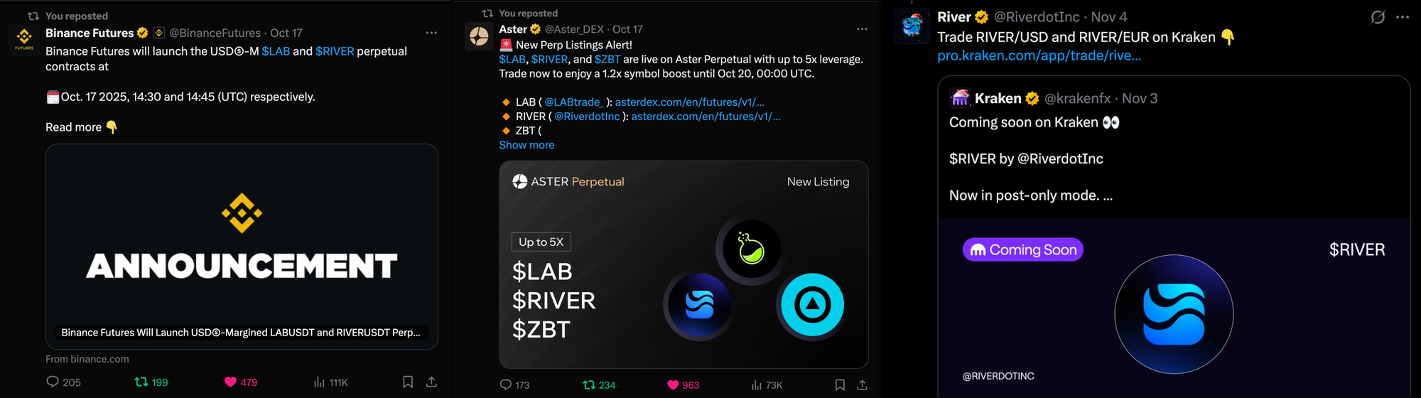 - $RIVER listed on Tier-1 CEX Perp, including Binance, Bybit, Kucoin, Gate and Bitget