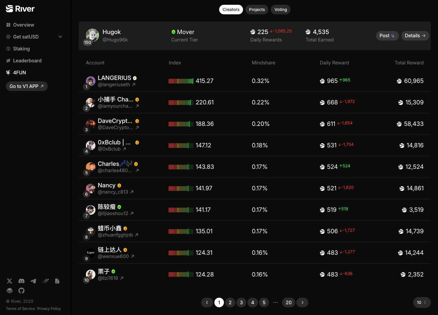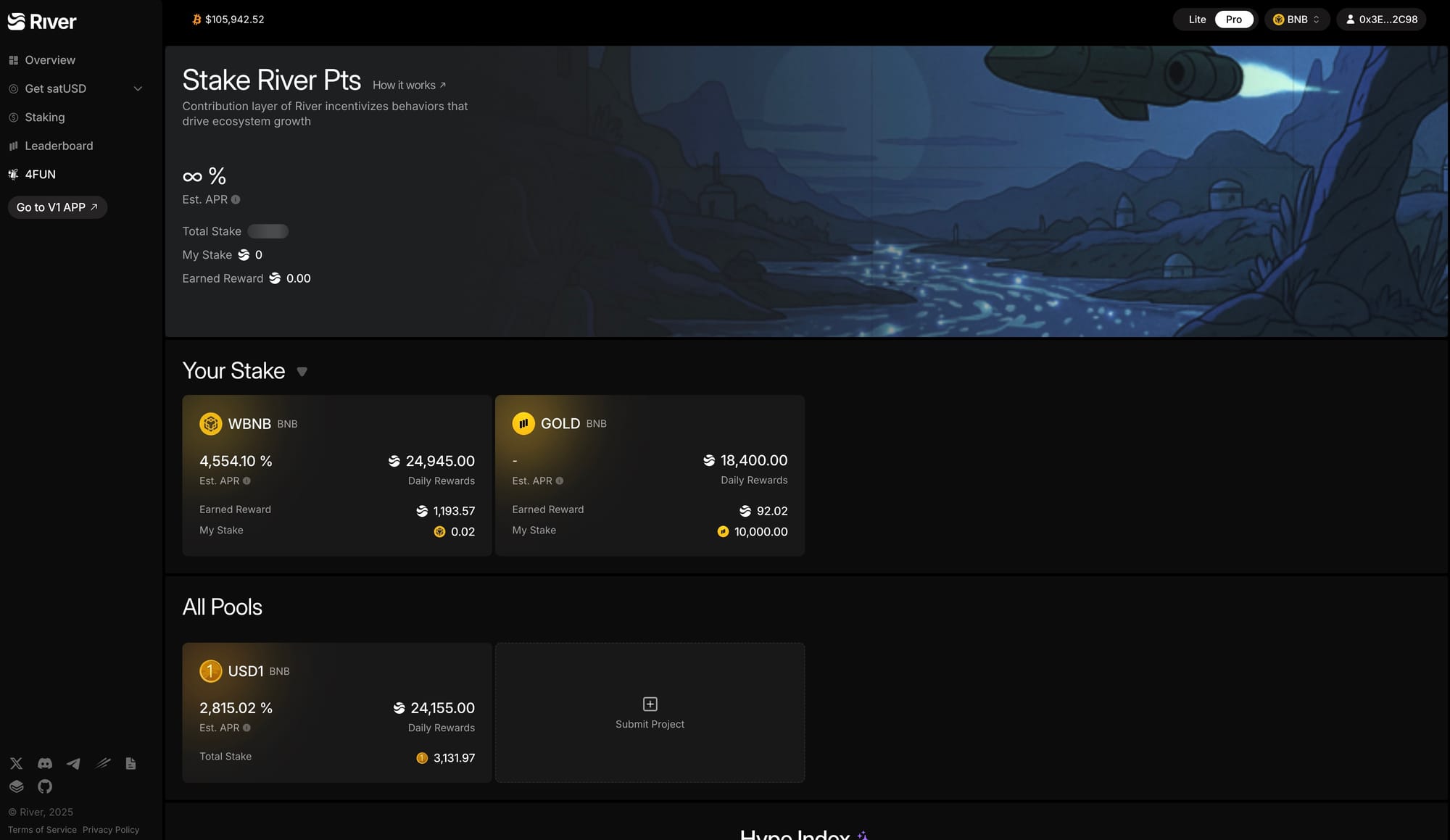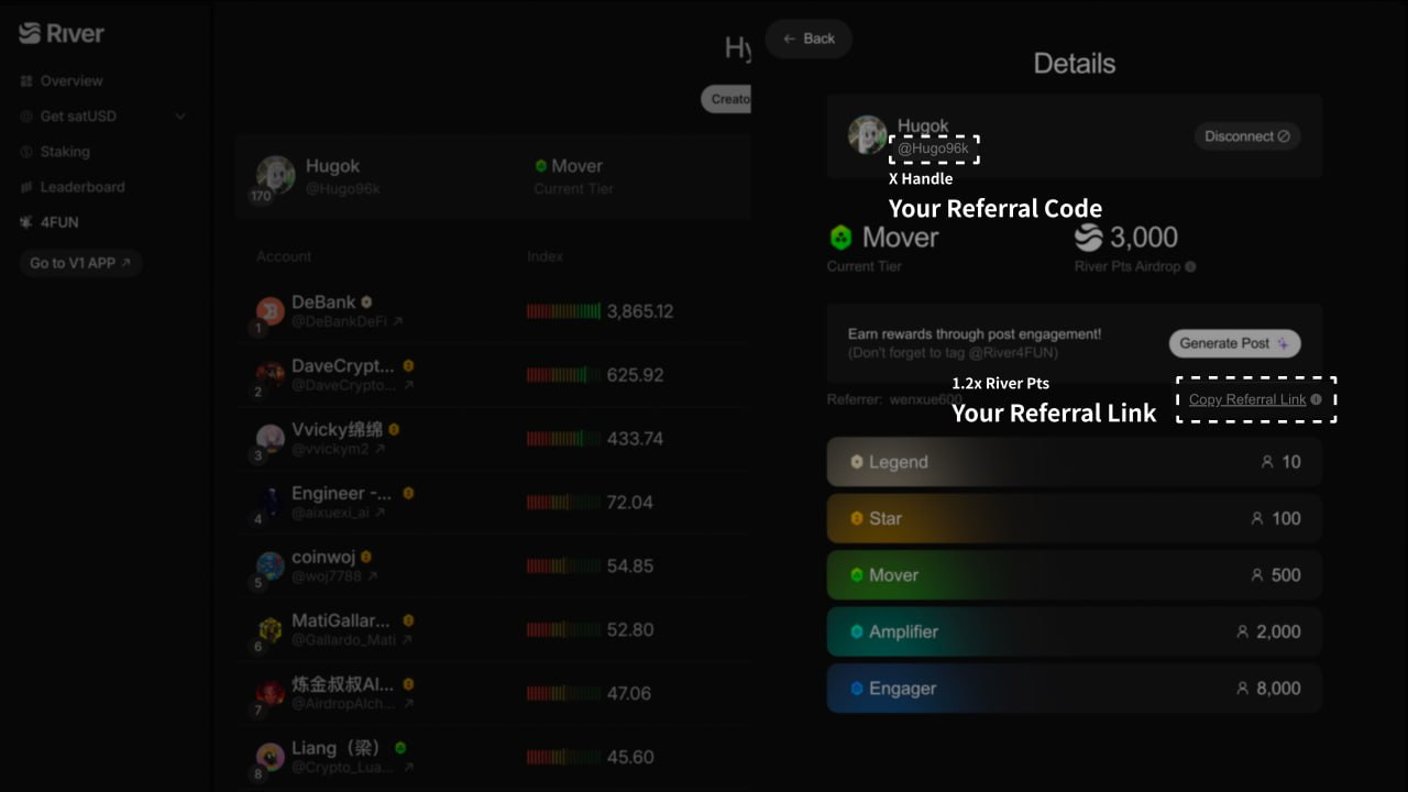 By staking assets and engaging on X (Twitter), users earn River Pts, that convert into the governance token $RIVER at TGE.