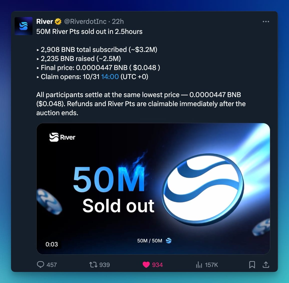 - Final auction price 0.0000447 BNB ( ~$0.048 ) per River Pts; +40% during auction