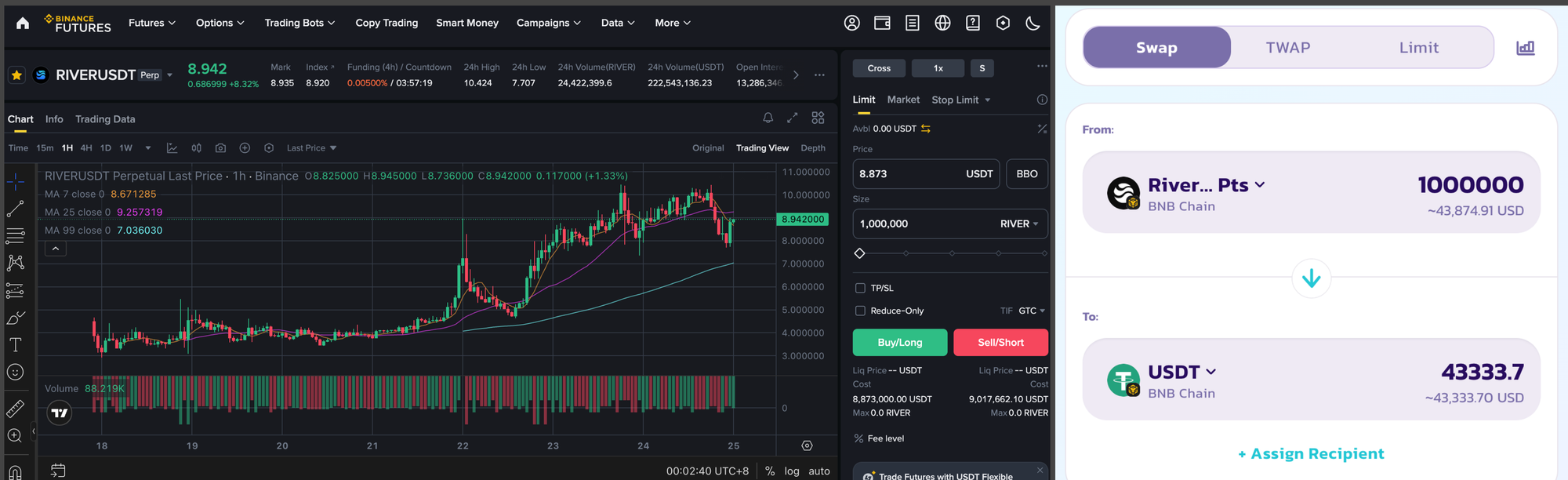 At the current DEX price, 1 M River Pts ≈ $43,000, aligning closely with the Day-49 conversion value (based on $RIVER = $8). This parity underscores market conviction in River’s long-term fundamentals and future valuation.
