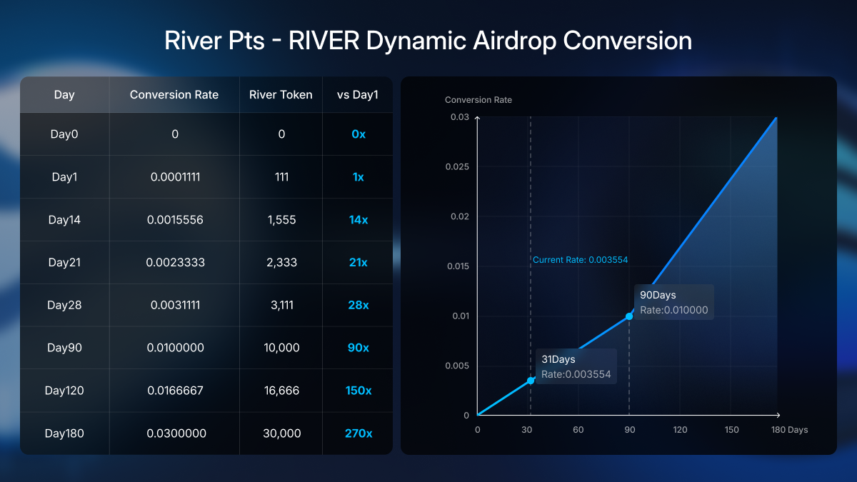River Pts holders can convert River Pts into $RIVER at any time within 180 days, with the conversion ratio rising along a dynamic curve.