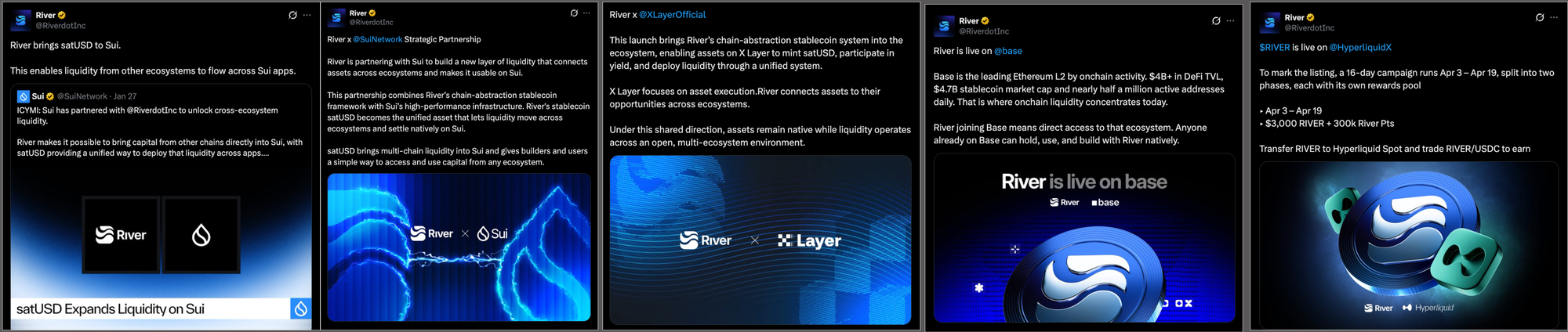 River expanded to X Layer, Hyperliquid, and Base. Integrations with $U stablecoin and cbBTC support went live.