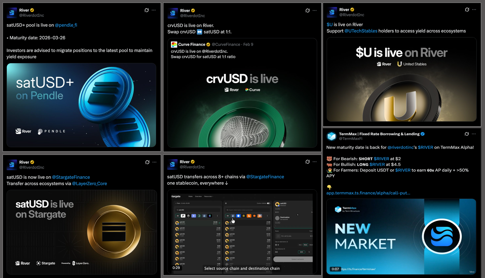 14 infrastructure and protocol integrations shipped during S4, extending satUSD and $RIVER reach through DeFi's core liquidity venues, including Curve, Pendle, PancakeSwap, and Stargate.