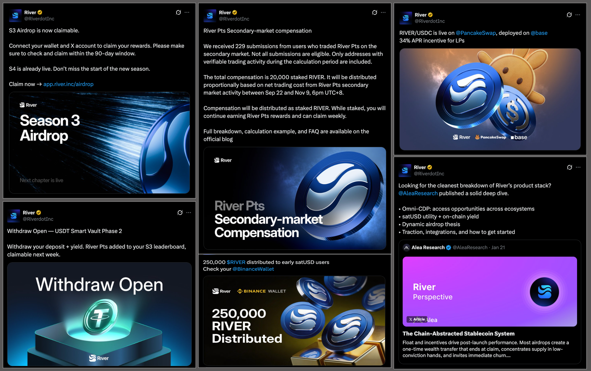 - Mar 10: 250,000 $RIVER distributed to early satUSD users