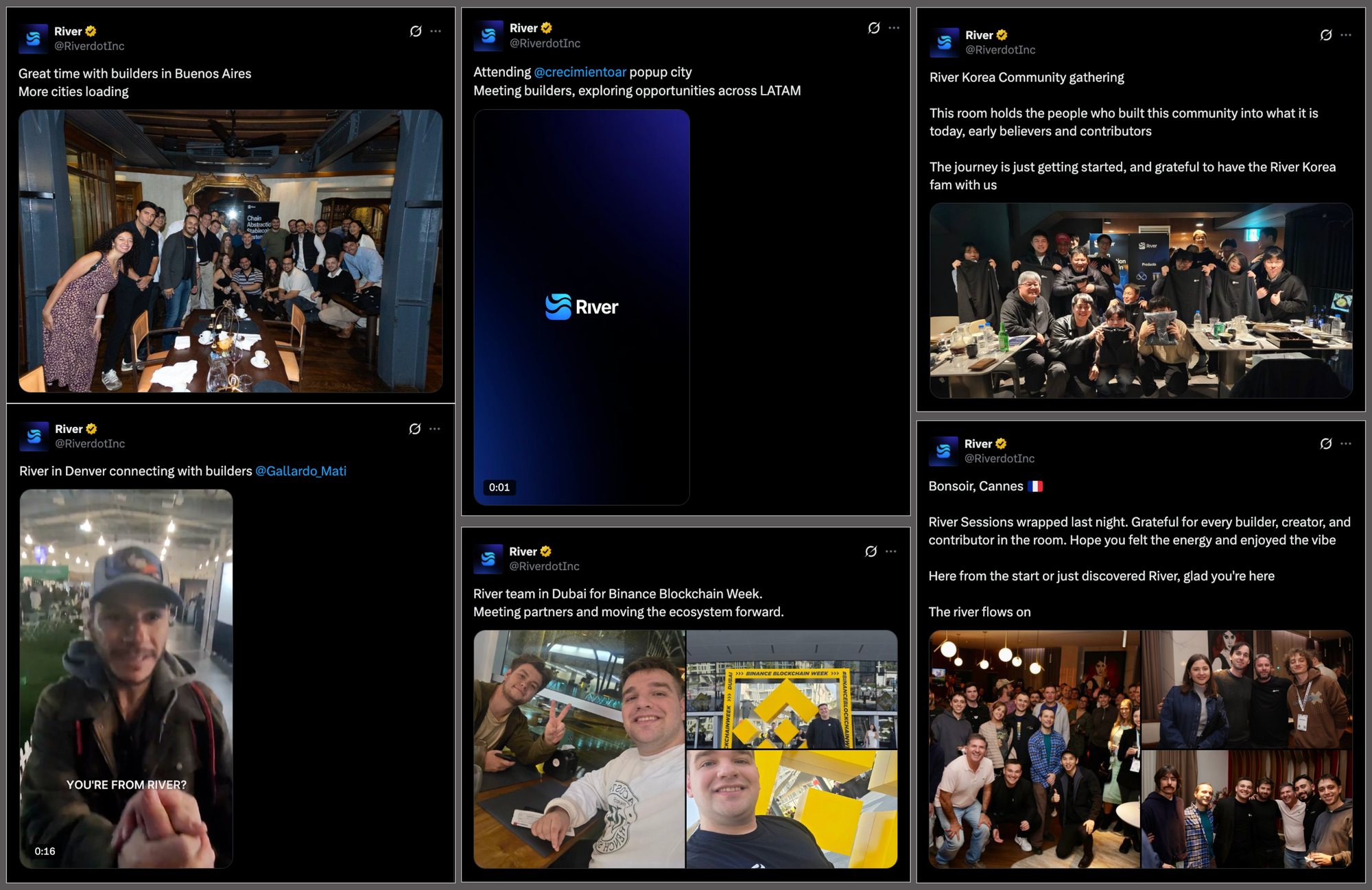 River Sessions ran in Hong Kong, Cannes, and Paris. The team also showed up at Binance Blockchain Week Dubai, Denver builders week, Buenos Aires, Crecimiento popup city, and a Korea community gathering.