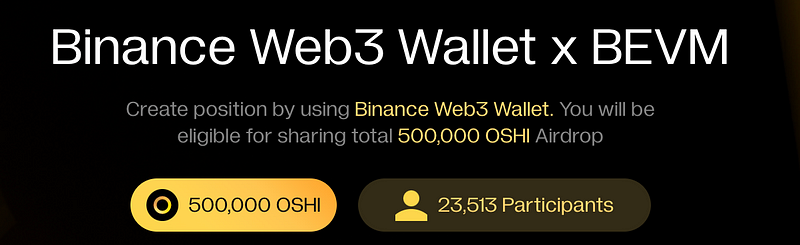To verify your eligibility for the OSHI airdrop, head over to the Satoshi Protocol app. Navigate to the “Campaign” tab and select “BEVM & OSHI Airdrop.” Once there, simply connect your Binance Web3 Wallet.