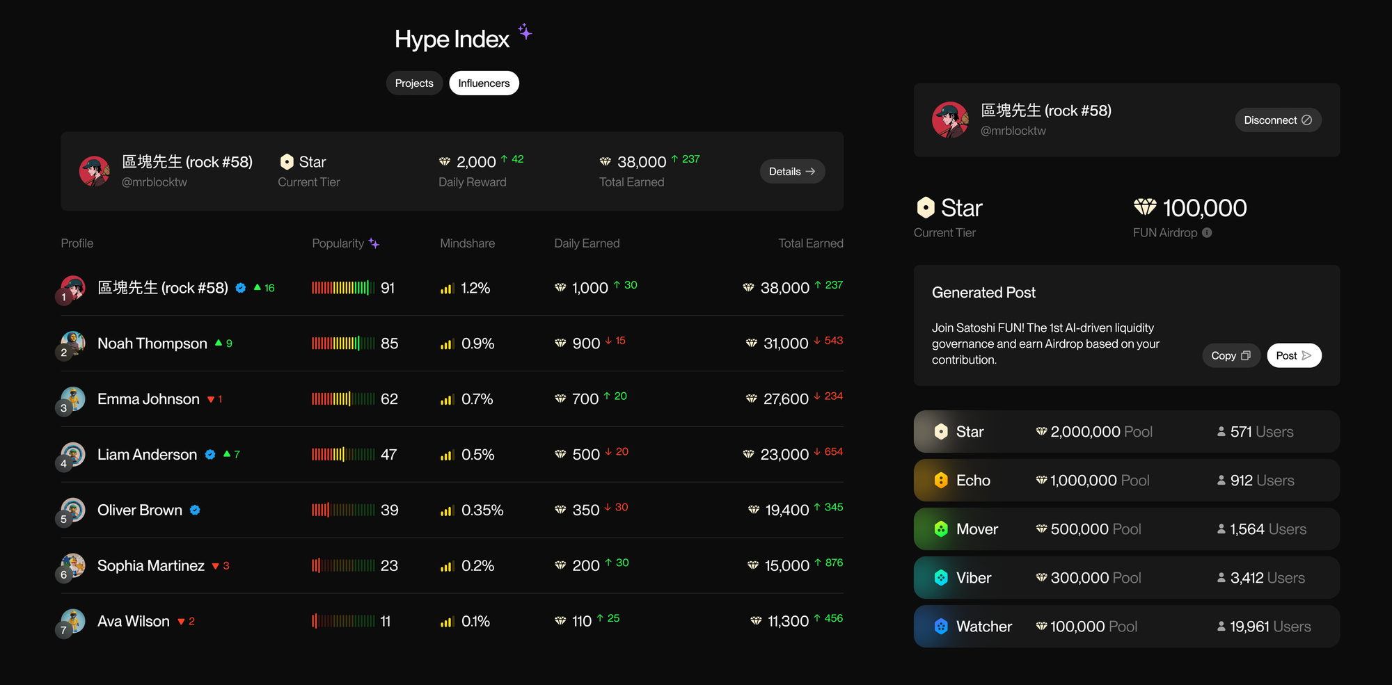 - Influencers have access to detailed daily analytics via their dashboards (Hype Index), enabling strategic adjustments to content quality, posting frequency, and engagement tactics to optimize Mindshare scores continually.