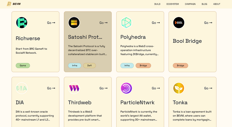This compatibility ensures a user experience that closely resembles that of Ethereum. On the BEVM ecosystem page, you can find 20+ projects currently being deployed on testnet.