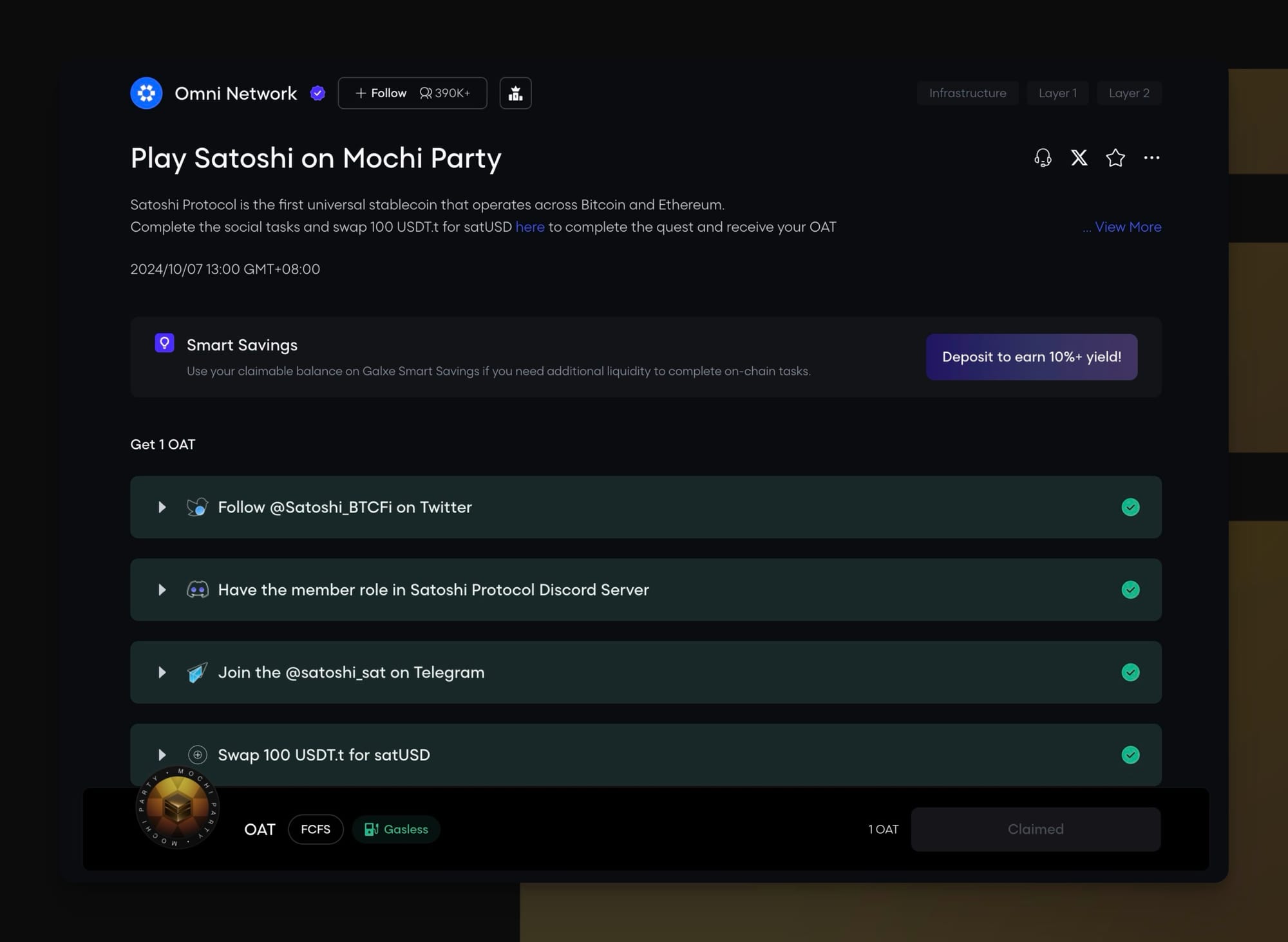 By participating, you not only get a firsthand look at how this technology works but also have the chance to earn exclusive Satoshi Protocol OAT rewards.