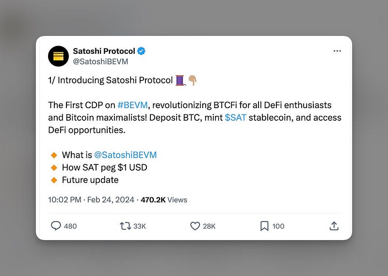 We unveiled ourselves as the first BEVM-based protocol for issuing BTC-backed stablecoins. This paves the way for the introduction of SAT, a stablecoin with the potential to unlock the immense liquidity of Bitcoin (BTC) and become a cornerstone for the burgeoning field of BTCFi.