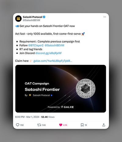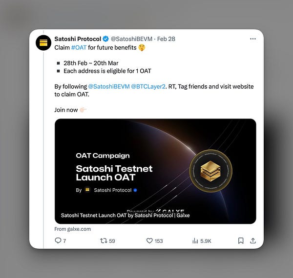 To participate, follow @SatoshiBEVM @BTCLayer2 on Twitter, retweet, tag your friends, and visit our website to claim your OAT. Each qualified address is entitled to claim a Testnet Launch OAT.