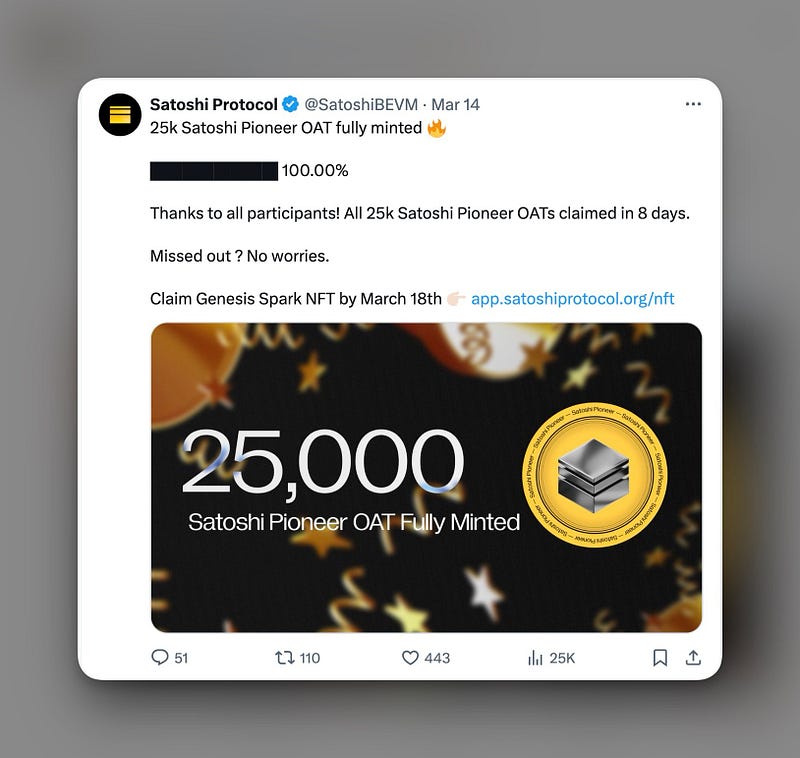 On March 12th, all 25,000 Satoshi Pioneer OATs were fully claimed. It only took 6 days, marking a successful campaign engagement for Satoshi Protocol.