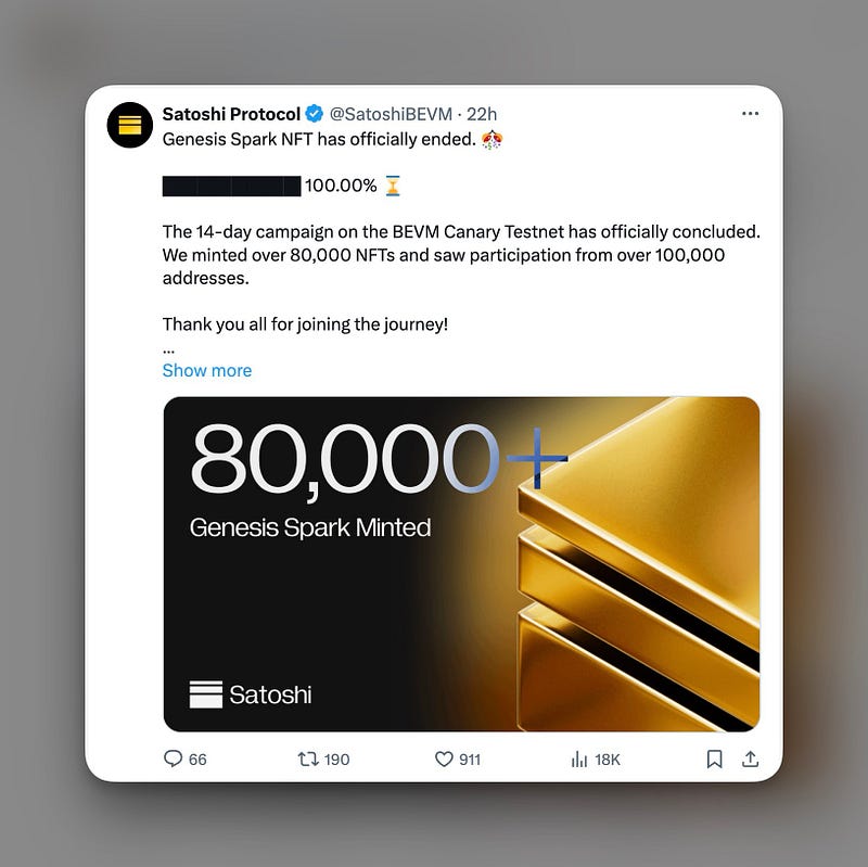 The 14-day campaign on the BEVM Canary Testnet has officially concluded. We minted over 80,000 NFTs and saw participation from over 100,000 addresses.