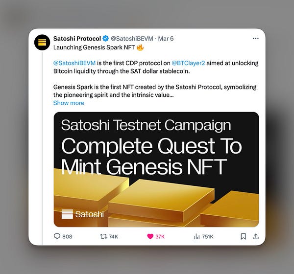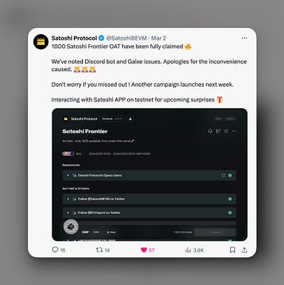 This successful testnet phase represents a major step forward for Satoshi Protocol as they prepare for their mainnet launch. The distribution of NFTs and OATs demonstrates the project’s commitment to rewarding its early supporters.