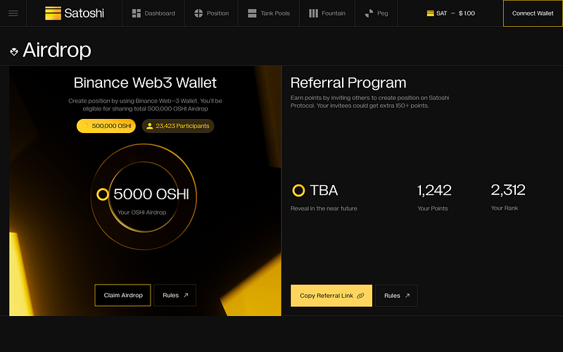 The Binance Web3 Wallet airdrop is just the beginning! Explore even more ways to earn OSHI with Satoshi Protocol: Leaderboard: Earn Position Points and Referral Points